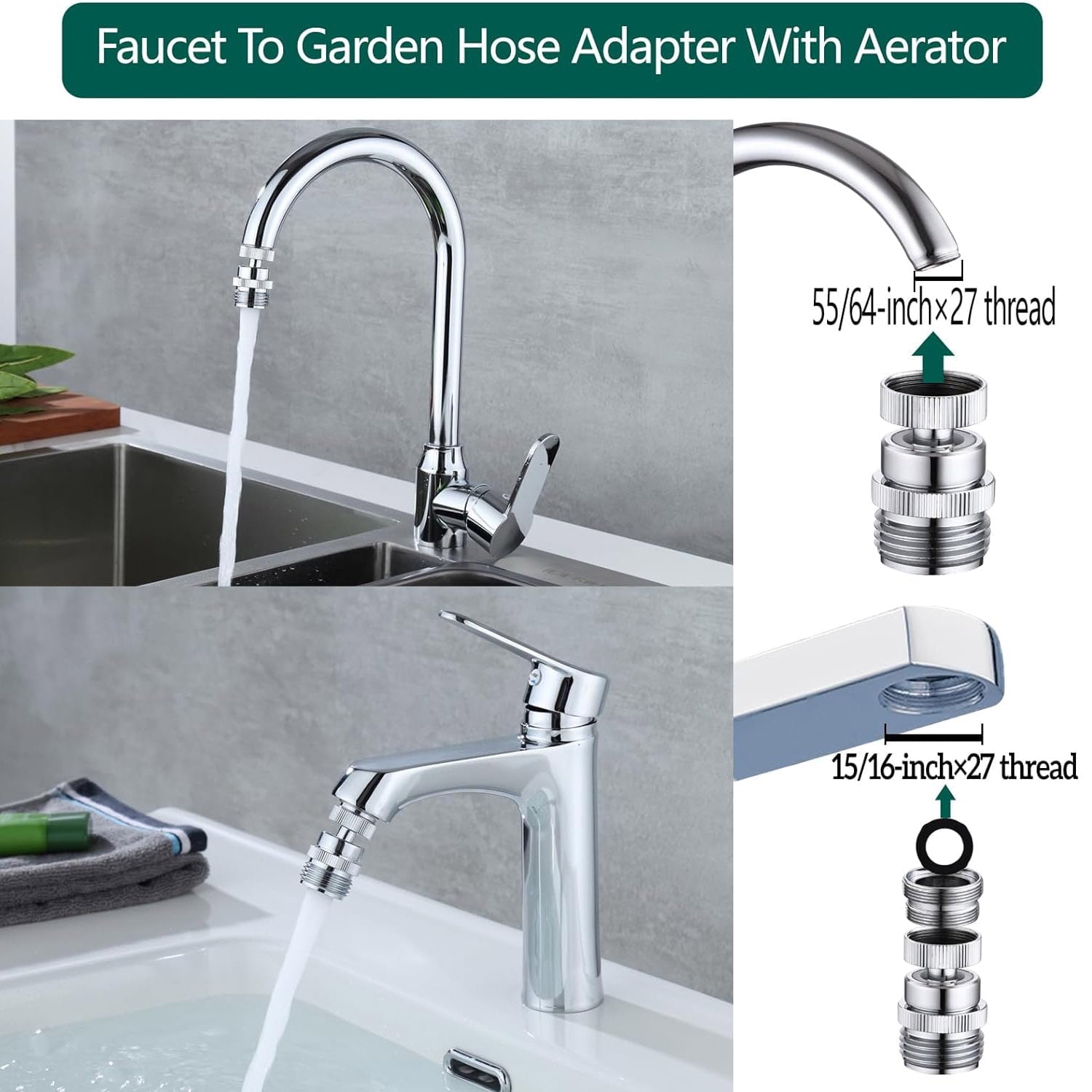 Standard Faucet Adapters:The male thread adapter with M24 (15/16" -27) male to M22 (55/64"-27) male for connection to M24 (15/16" -27) female thread faucet and M22 (55/64"-27) female thread adapter. The self-contained M22 (55/64"-27) female to 3/4" male thread adapter for connection to M22 (55/64"-27) male thread faucets and garden hose.