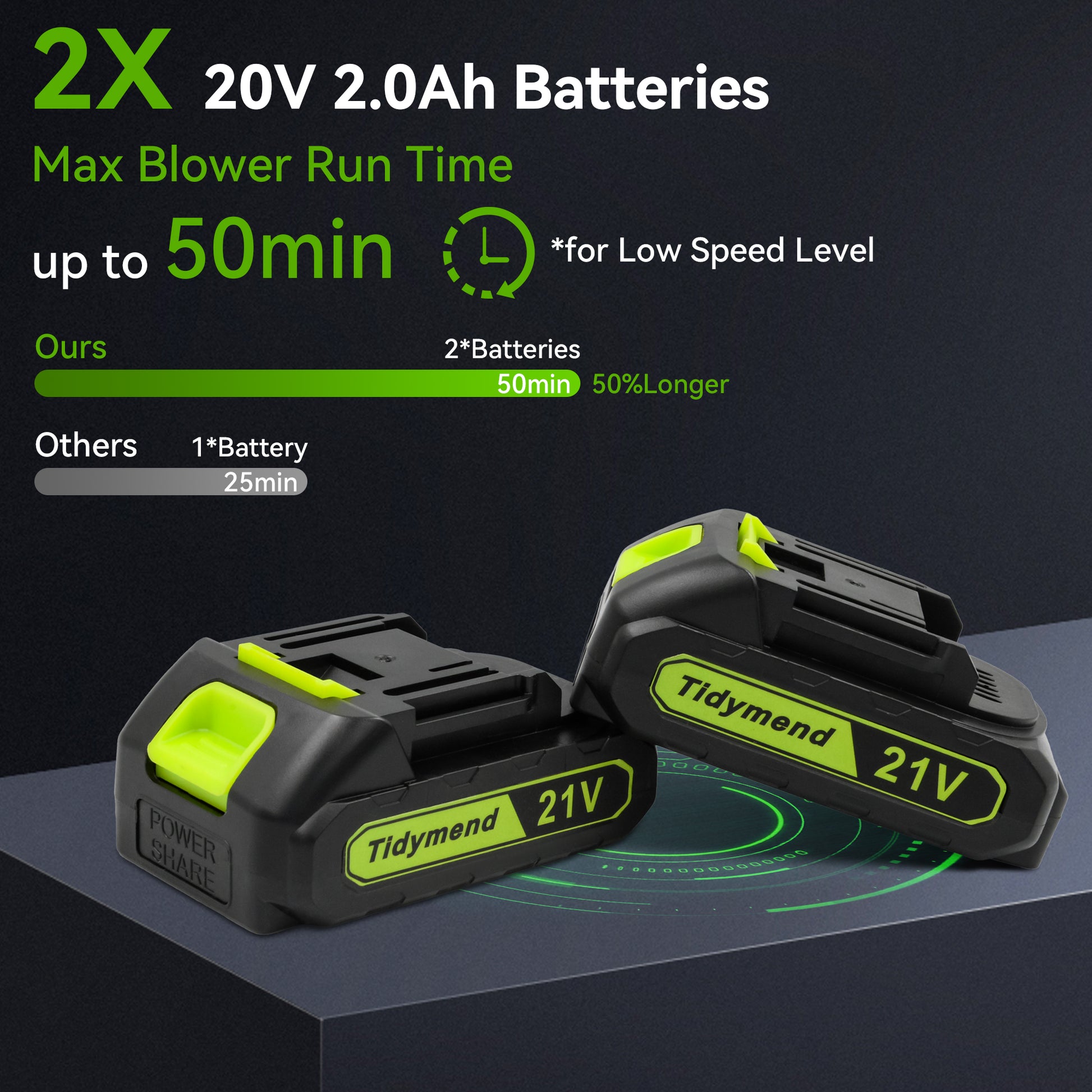 Leaf blower with battery and charger includes two 20V 2.0Ah batteries and a direct charging adapter. Run up to 50 minutes on low speed (about 25 minutes per battery) or 20 minutes on high speed (about 10 minutes per battery), alternating batteries for uninterrupted cleaning. Fast charging keeps one battery always ready.