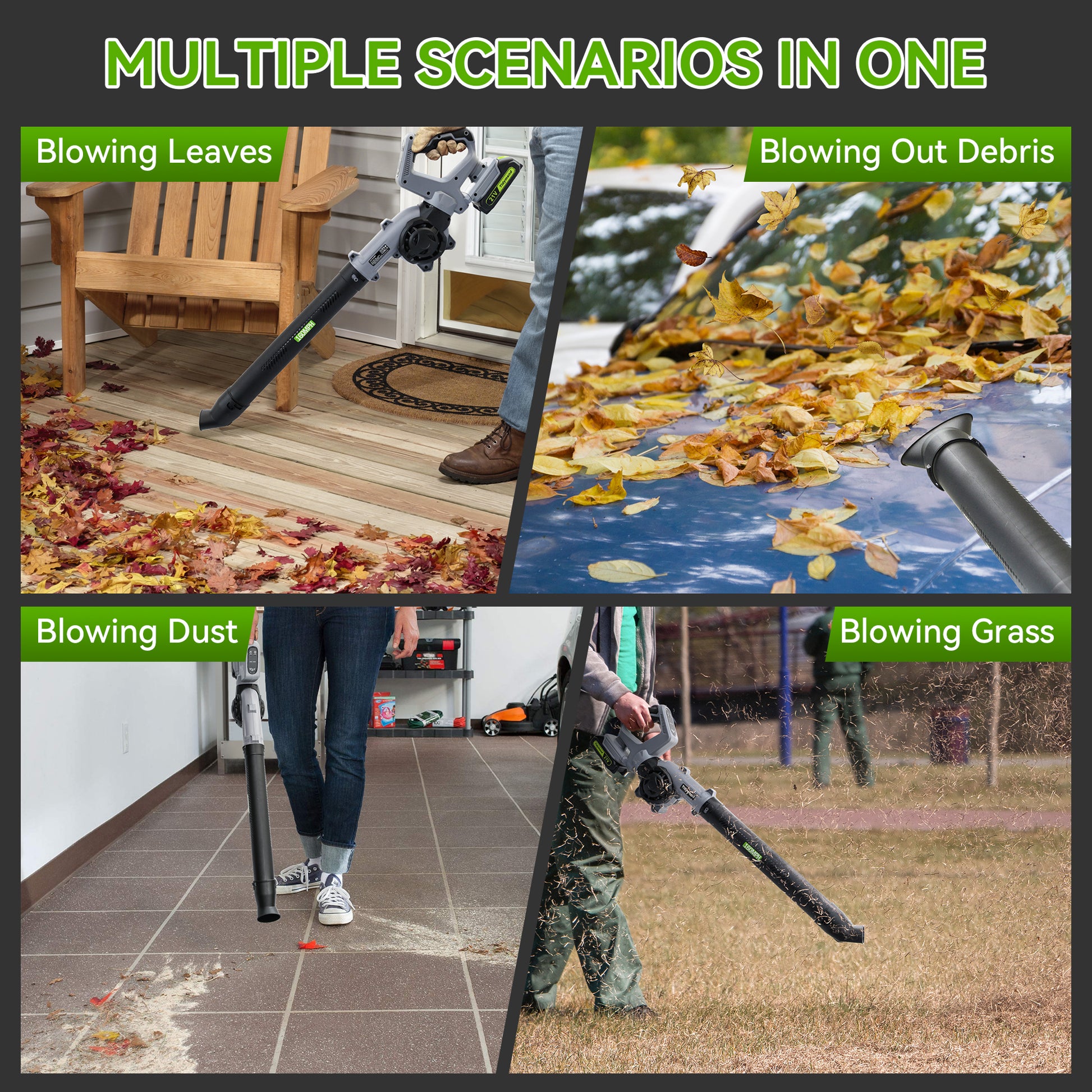Equipped with a 17,000 RPM motor, this cordless leaf blower delivers up to 190 CFM airflow and 160 MPH wind speed, making it perfect for clearing leaves, debris, dirt, spider webs, and even light snow from your yard, driveway, patio, and garage.