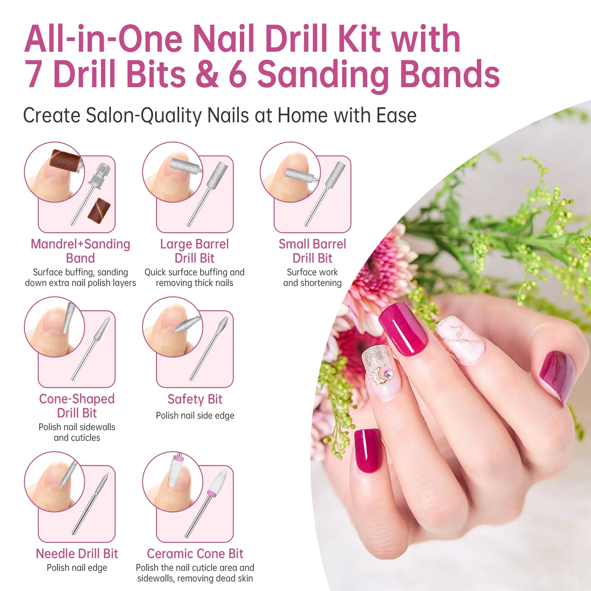 - Multifunctional Nail Drill Kit with 7 Drill Bits & 6 Sanding Bands: This versatile nail drill kit includes everything you need for a complete manicure experience. With 7 professional drill bits and 6 sanding bands, it’s perfect for grinding, shaping, carving, polishing, and cuticle removal. Whether you're smoothing rough edges, removing acrylic nails, or perfecting intricate nail art, this high-quality nail drill meets all your needs. Plus, it makes an excellent gift for nail enthusiasts, friends, or family members who love to pamper themselves with salon-quality nail care at home.