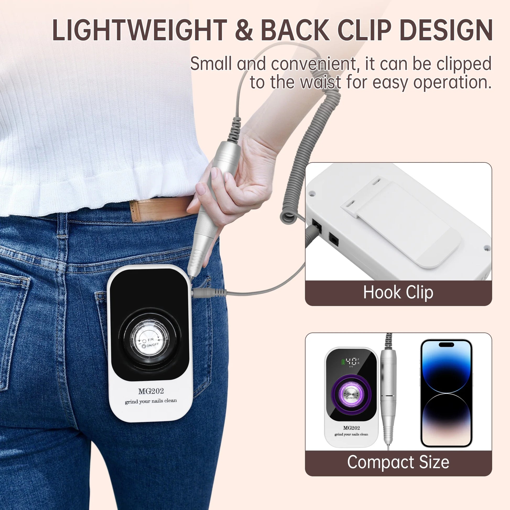 - Lightweight & Portable with Convenient Storage: This electric nail drill features a compact and lightweight design, making it easy to carry and store. The built-in belt clip allows you to hang it on your waist for easy access, whether you're at home or on the go. The base stand includes 6 drill bit collector holes, keeping your workspace organized and saving you time and hassle. Ideal for both professional use and personal care, this nail drill offers convenient storage and ensures a tidy, efficient nail care routine.