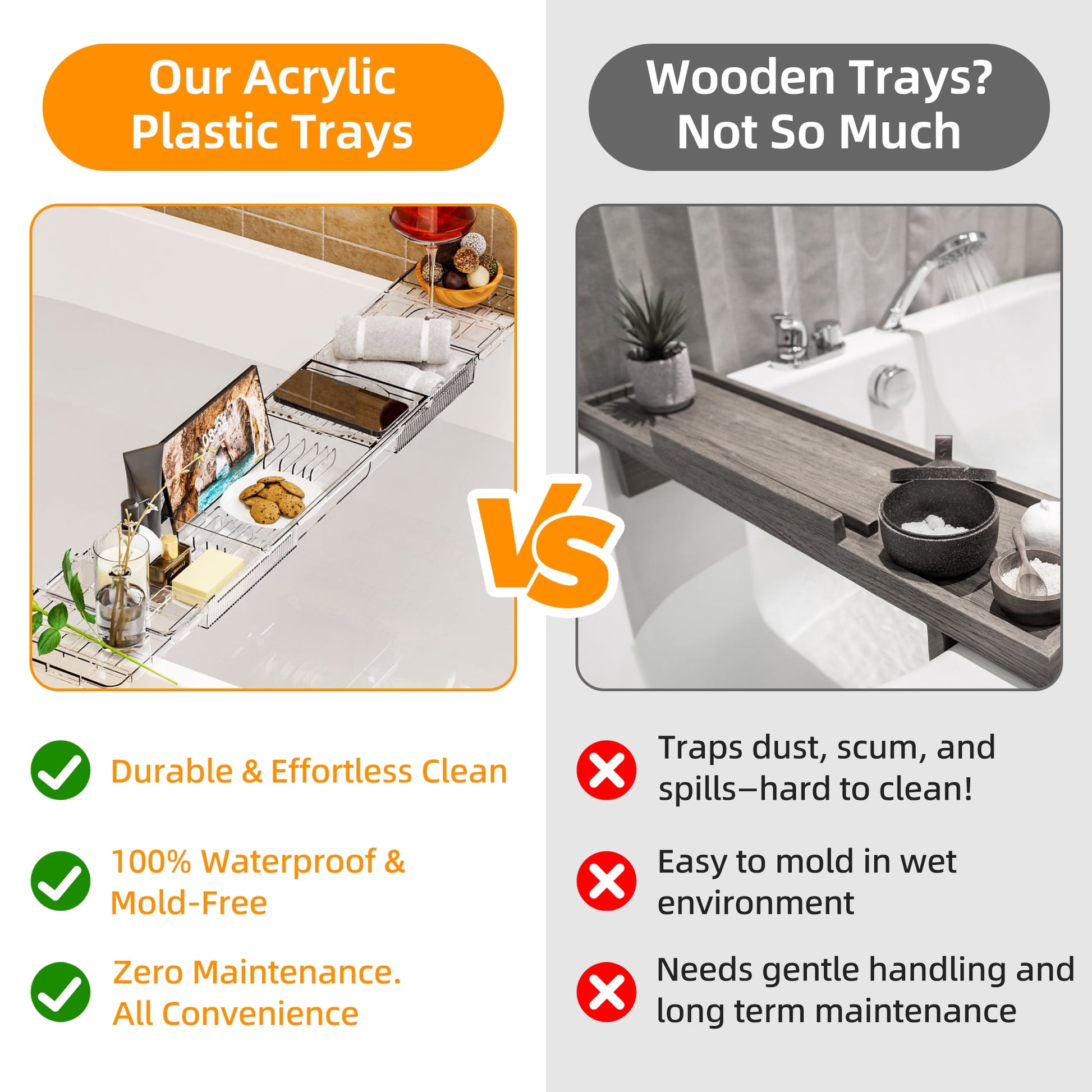 - Sturdy & Hassle-Free Maintenance - Say goodbye to the worry of moldy wooden trays. Our bathtub caddy is crafted from high-quality acrylic plastic, not only durable but also a breeze to wash directly with water. It’s 100% moisture-proof and mold-proof, has no special requirements for storage, making this tub tray perfect to use in the steamy bathroom environment.