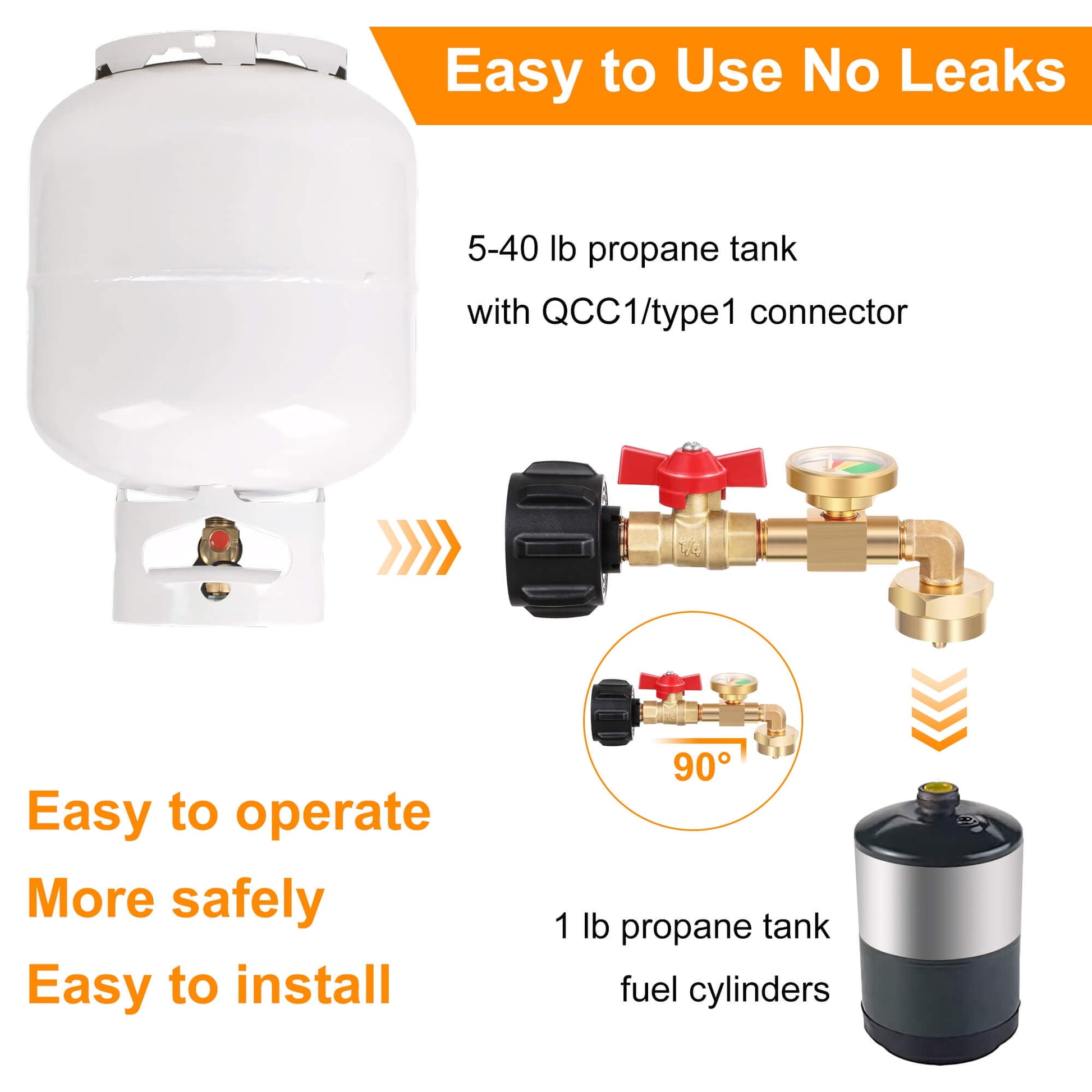 You can easily connect your 5lb to 40 lb tank cylinders to small 1 lb bottle refill propane gas to meet your camping, BBQ party needs. Fits for heater, camp stove, portable grill, tabletop grill, and more. Great for camping, tailgating, heating needs or having an outdoor cookout.