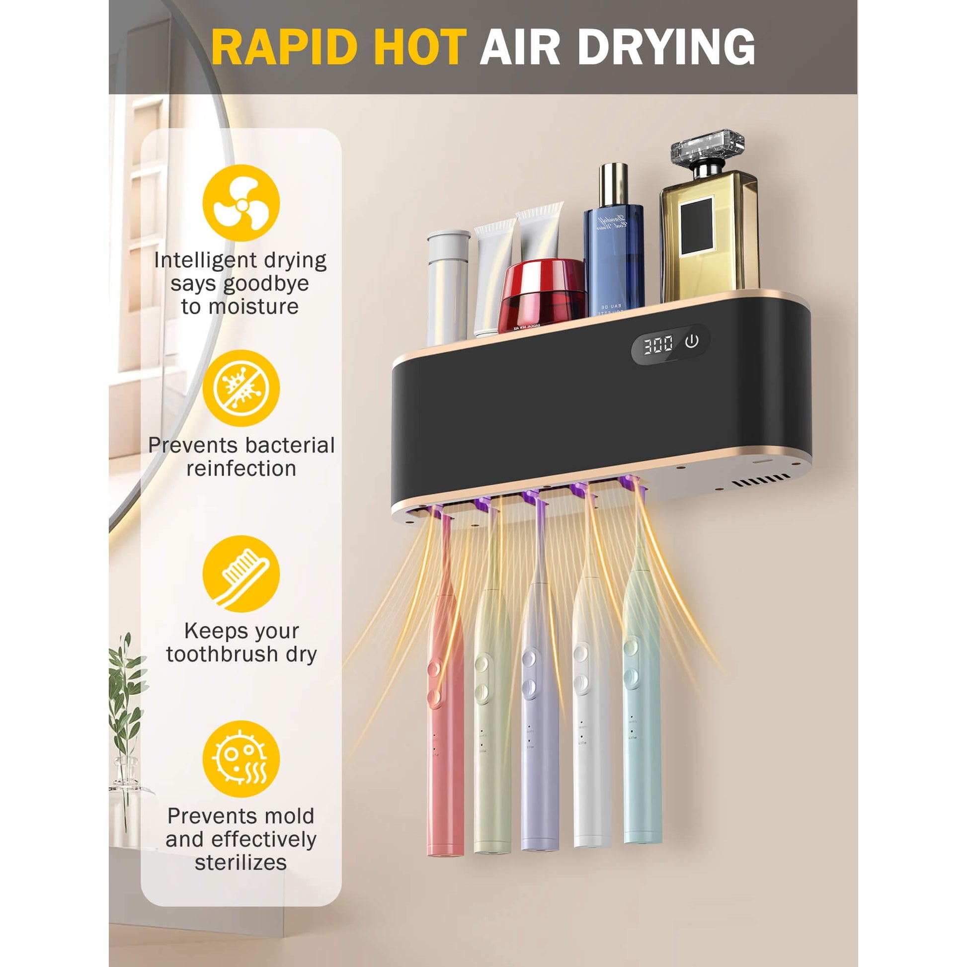 - This toothbrush sanitizer and holder uses dual-wave UV light to eliminate 99.99% of bacteria while warm air drying prevents mold growth. Keep your brush clean, dry, and always ready to use!