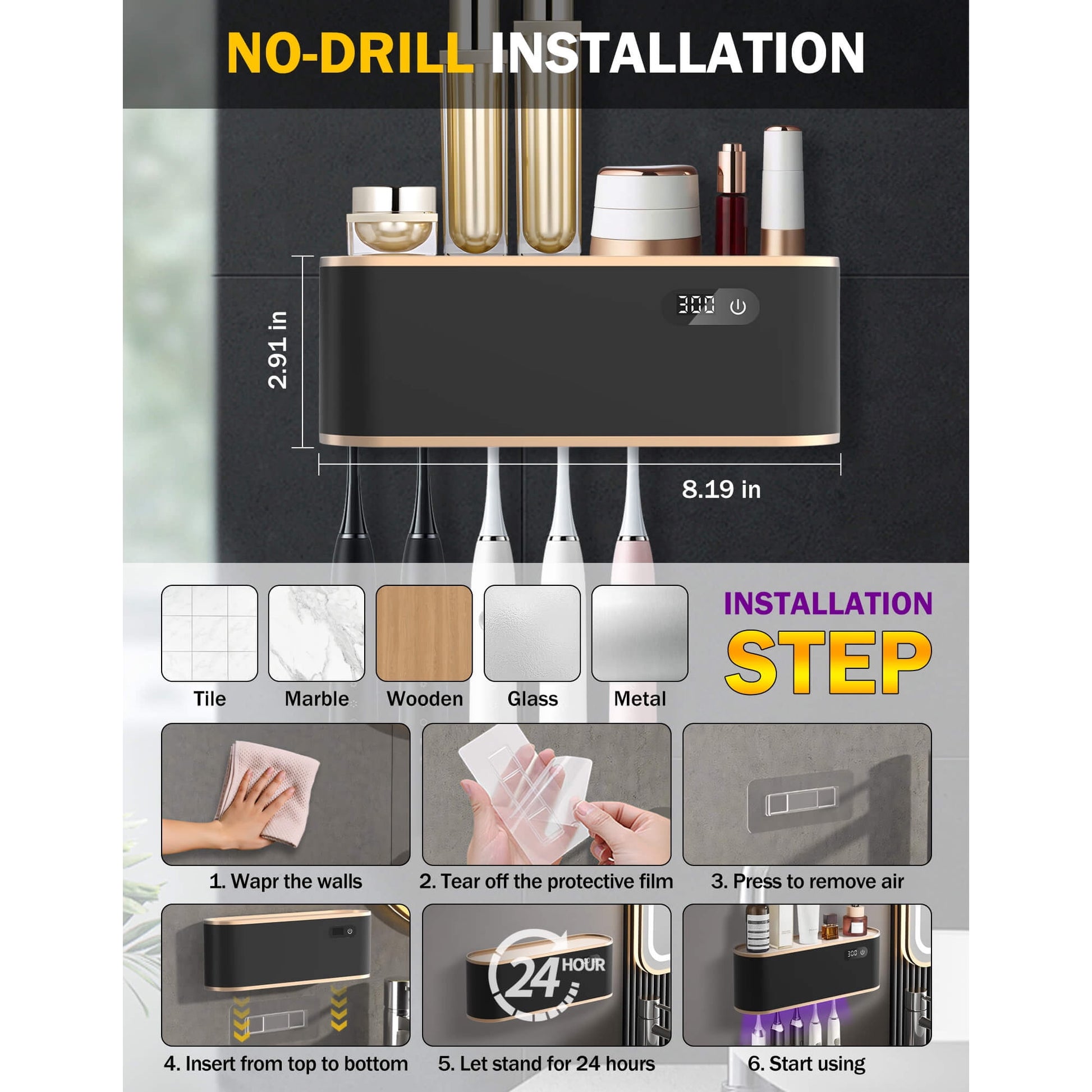 - This wall mount toothbrush holder installs with strong adhesive, keeping your walls damage-free. Waterproof and secure, it stays firmly in place, even in humid bathrooms!