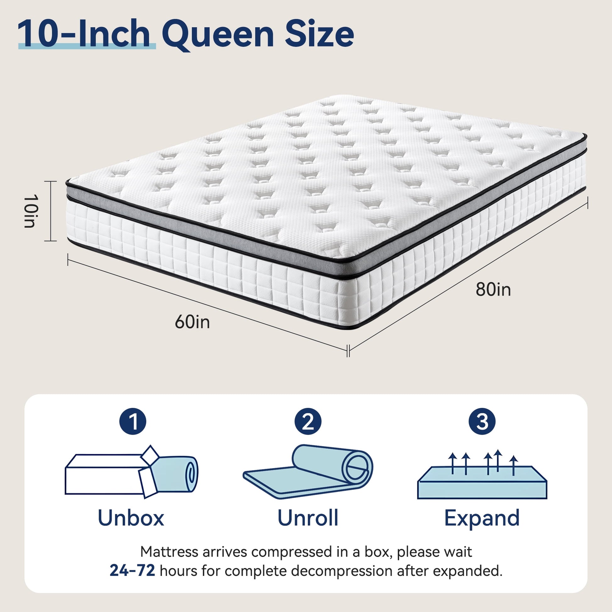 - EASY SETUP: The queen hybrid mattress 10 inch is compressed, rolled, and shipped in a box for easy setup. It is compatible with all frame types, including box springs, floors, slatted bases, flat platforms, and hospital beds. Queen Size: 80''L x 60''W x 10''H. NOTE: Please wait 24-72 hours to fully expand your mattress after unboxing. (Exercise caution during the mattress's rapid unfurling process.) If you have any questions, feel free to contact our 24/7 support team.