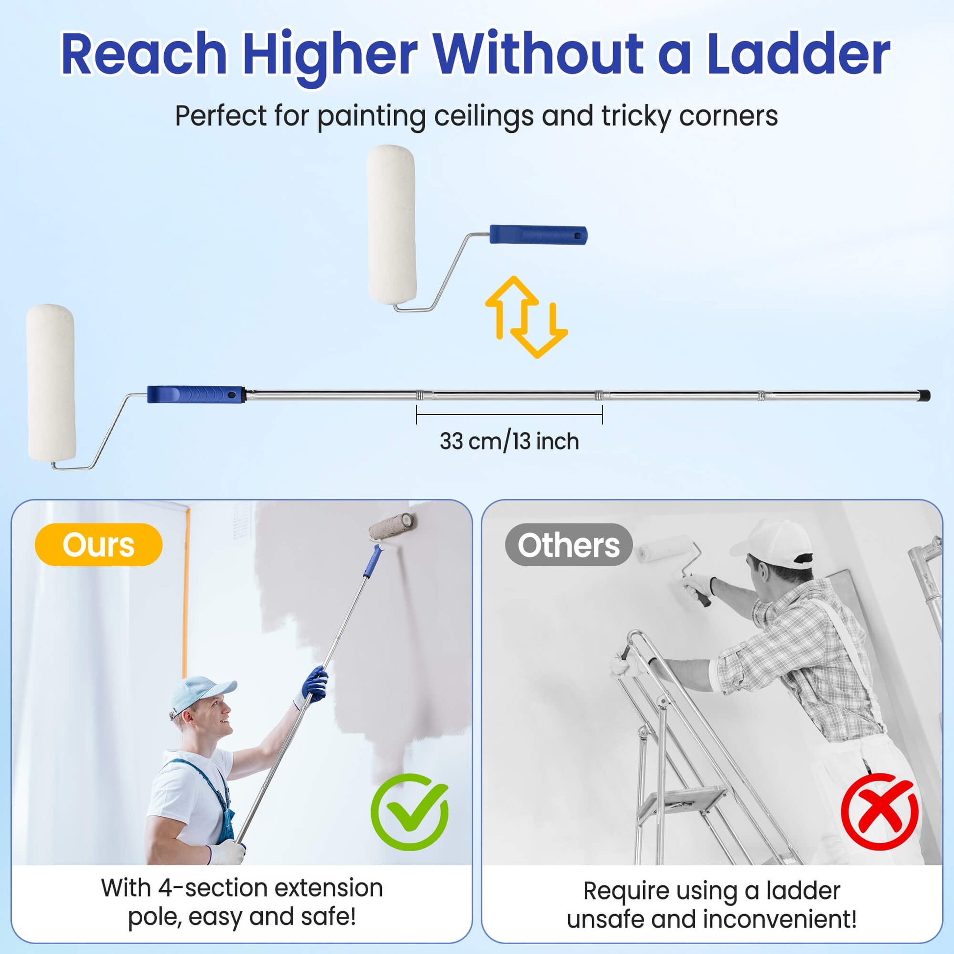 - Our paint roller kit comes with 4 extension poles, so you can easily extend the handle to paint ceilings and tricky corners—no ladder needed! Stay comfortable and avoid back strain while getting the job done faster.