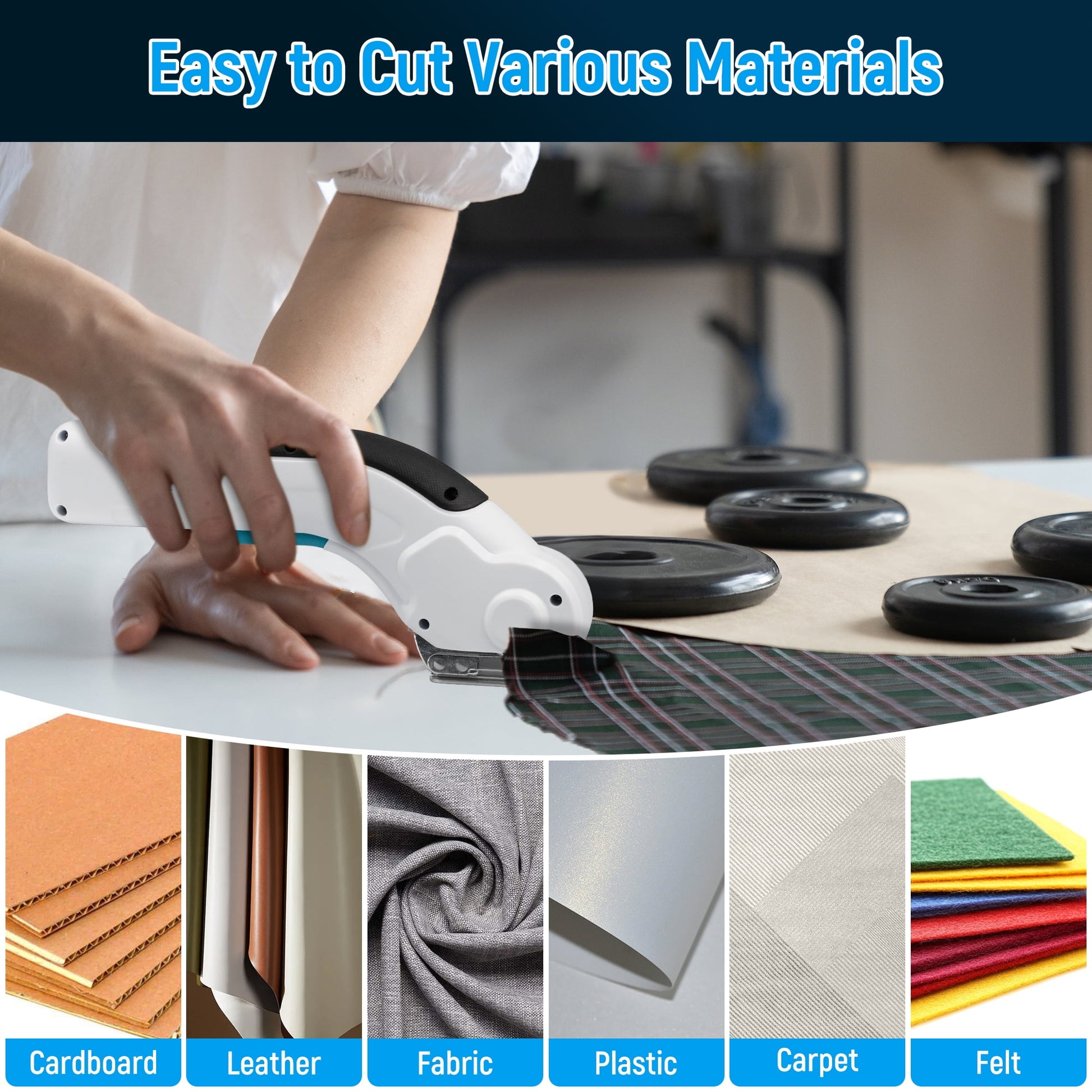 - Multifunctional Cutting: Designed for designers, tailors, DIY enthusiasts, and anyone passionate about handicrafts, this tool excels at cutting materials up to 0.24 inches (6mm) thick—including ultra-thin metal sheets within the submillimeter range. From cardboard, fabric, and felt to plastic, paper, leather, carpet, and packaging, it handles a wide variety of materials with precision. Each set includes electric scissors, an extra replacement blade included as a bonus, a USB charging cable, a storage bag, a screwdriver and a user manual, making it a practical gift for everyday use.