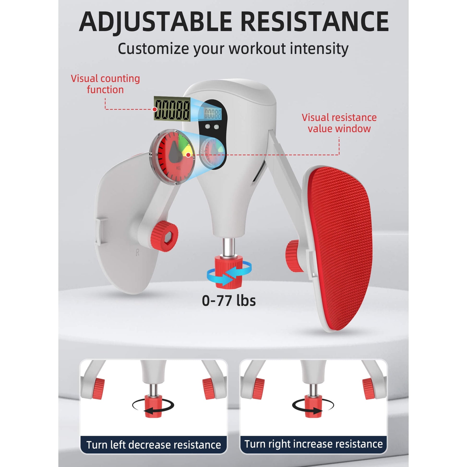 - Built with a powerful steel spring system and a labor-saving adjustment knob, this thigh exerciser lets you easily adjust the resistance from 0 to 77 lbs. Customize your workout intensity to effectively enhance arm and leg strength.