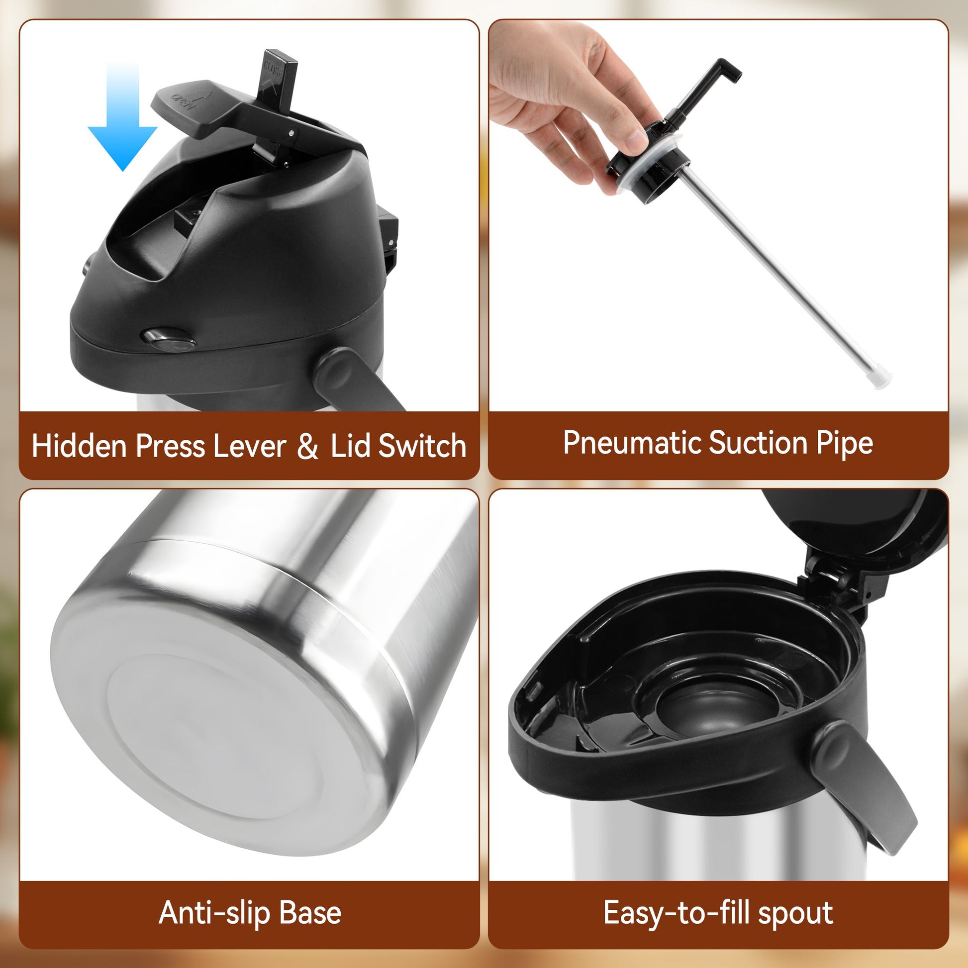 - Easy to Fill and Clean: The lid of the airpot is designed to open by a special switch. With the removable pump inside, it's easy to clean with a brush, and convenient to fill ice cubes to make iced drinks in Summer!