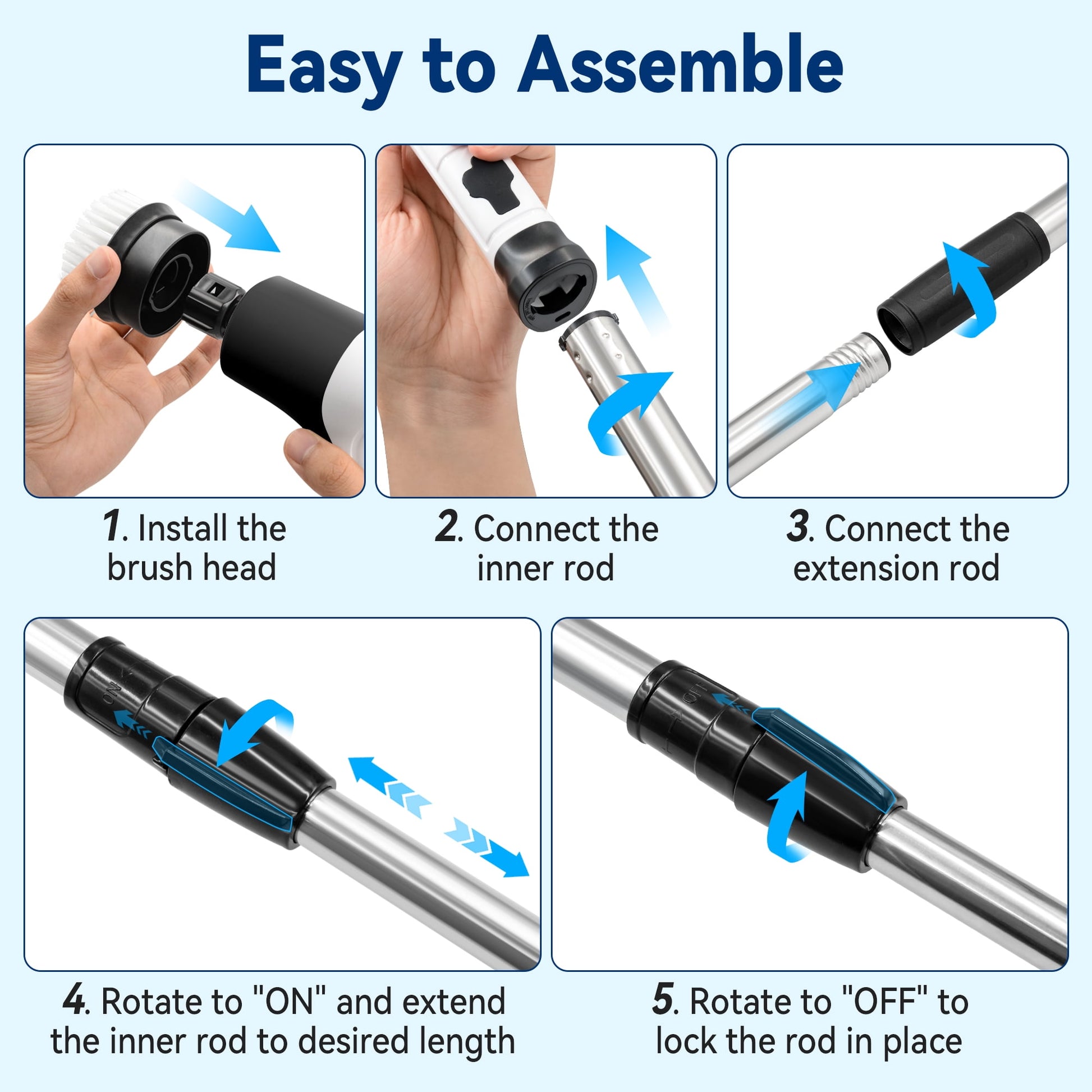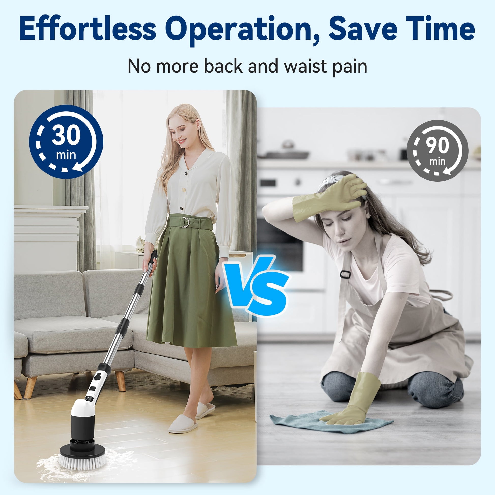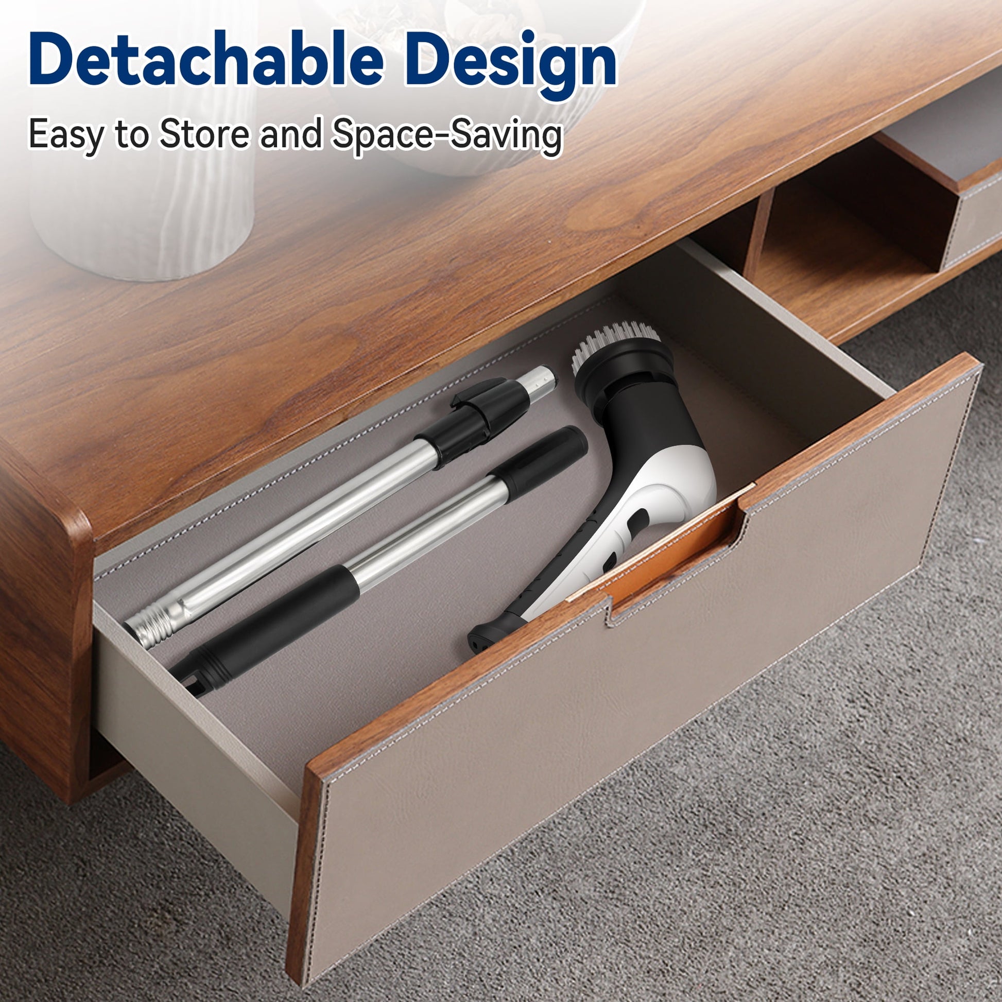 - ULTRA LIGHTWEIGHT DESIGN & LENGTH ADJUSTABLE: The handle length of our electric scrubber can be adjusted from 11-inch to 47-inch. Detachable designed with a portable and compact size, which allows for easy storage in a drawer or in the trunk of a car. It's smaller and lighter than the normal ones! The detachable scrubber can be used as a small appliance for close-up cleaning without installing the handle.