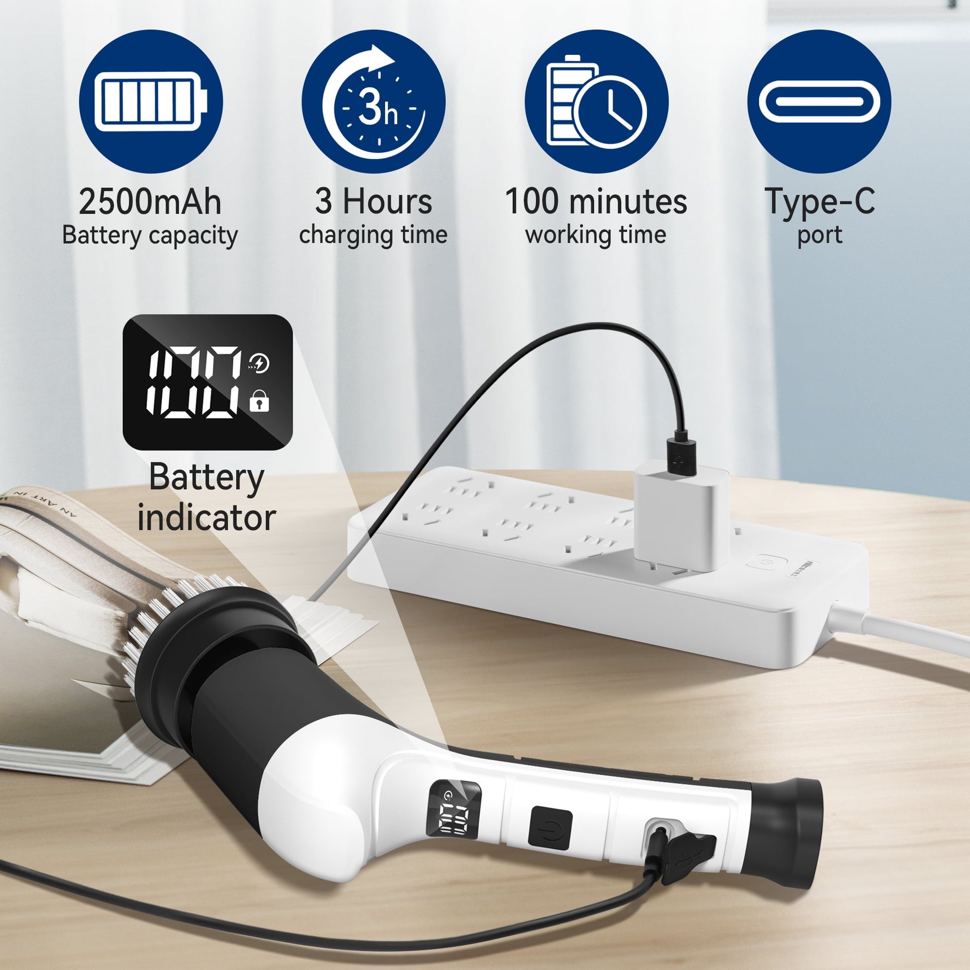 - CLEAN WITHOUT EFFORT: With its adjustable length, the flexible power scrubber adapts to all kinds of hard-to-reach places, such as the shower head,ceiling or faucet gap, without bending over or stretching your arms. Built-in 2500mAh large capacity battery that lasts up to 90-100 minutes’ continuous use.