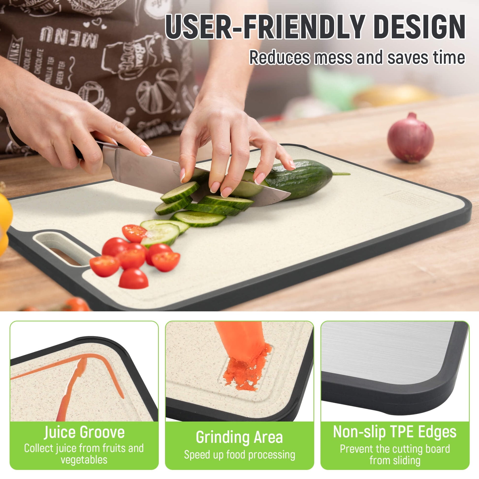 - Keep your kitchen tidy with our wheat straw PP cutting boards non toxic. The built-in juice groove catches liquids to prevent spills, while the integrated garlic grinding zone lets you prep garlic or ginger right on the board—no extra tools needed. Saving you time and cleanup.