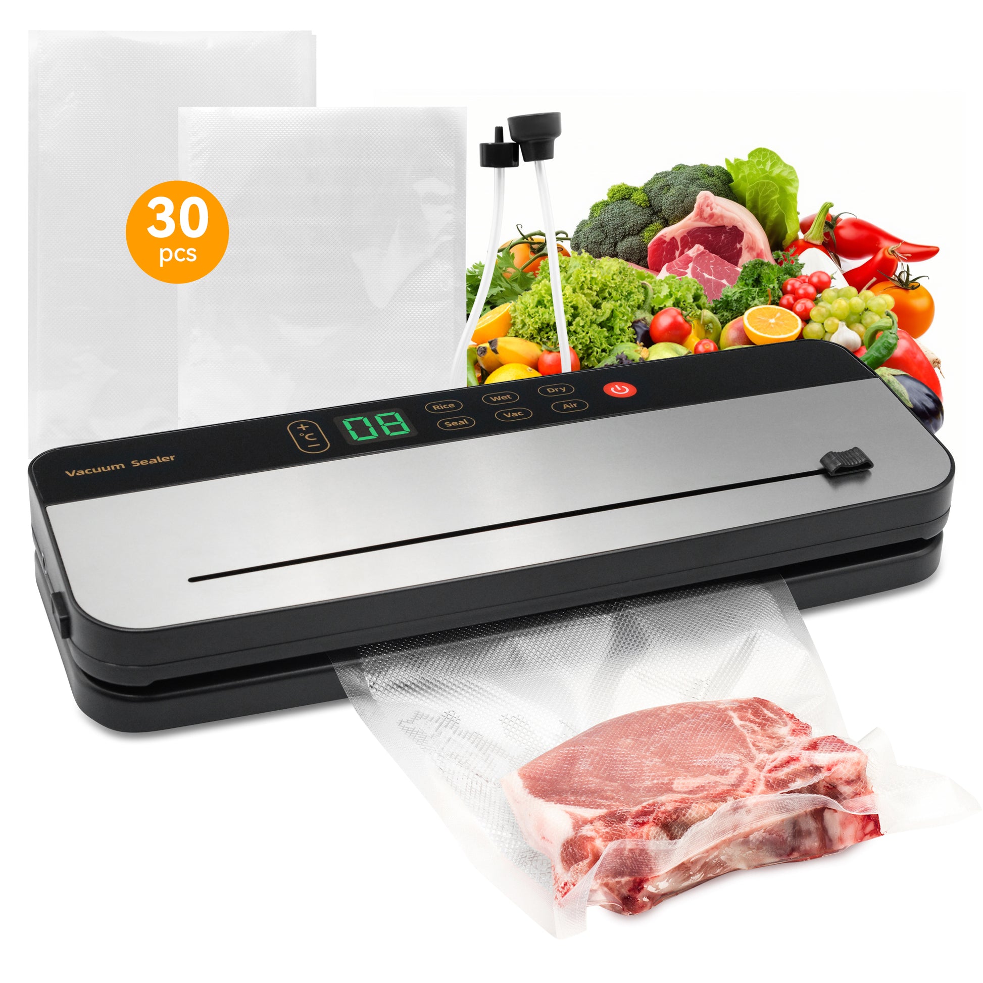 6-in-1 Sealing Modes & Includes Cutter Functions: Wet & Dry Modes - Maximize freshness for different types of food; 'Rice' Mode- One touch operation, automatically vacuums and seals food; 'Seal' Mode- Quick seal only, for bagging pre-vacuumed food or fragile items; 'Vac' Mode- manually control the vacuum process, press & hold to vacuum, release to stop, suitable for precise control or delicate foods; 'Air' Mode- External vacuum, for containers, jars, or bottles equipped with a vacuum port. Build in top cutter- Easily customize bag size.
