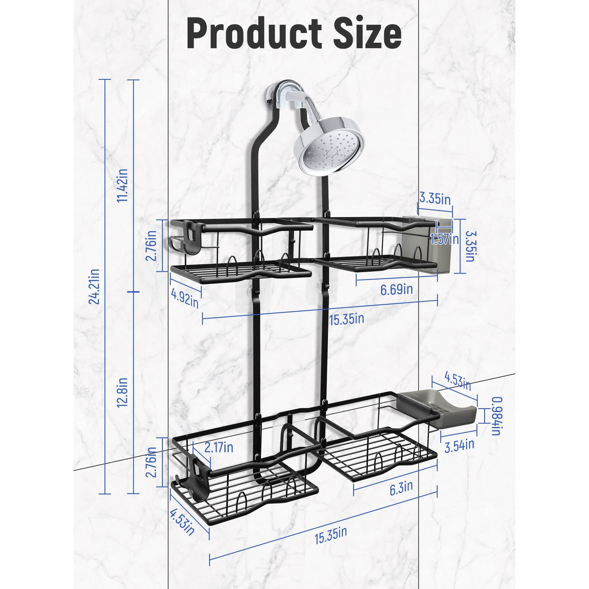 Featuring two large baskets (6.69”x4.92”) and two medium baskets (6.3”x4.53”), the Sentryse black shower caddy can hold lots of shampoos, conditioners, body wash, and other shower essentials. Added 12 hooks for loofahs, sponges, and towels. Dedicated soap holder, toothbrush holder and razor holder of the shower rack keep soap, toothbrush and razor within reach, maximizing vertical shower space.