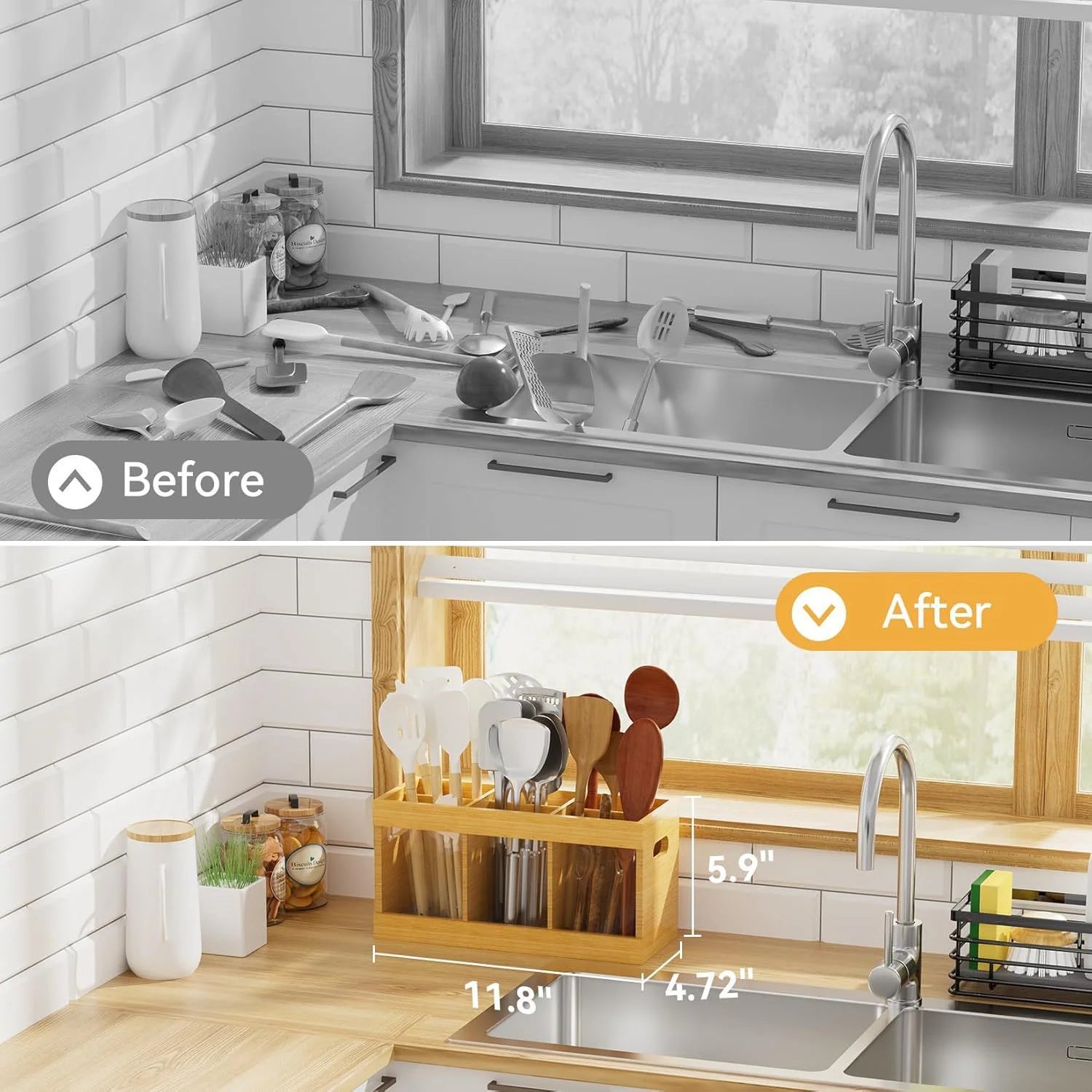 Designed to keep different utensils neatly separated, so everything has its own place.No more overcrowded jars or searching for the right tool — keep your kitchen utensils organized, visible, and easy to reach.Large Size: 15.74" × 7.08" × 5.9"