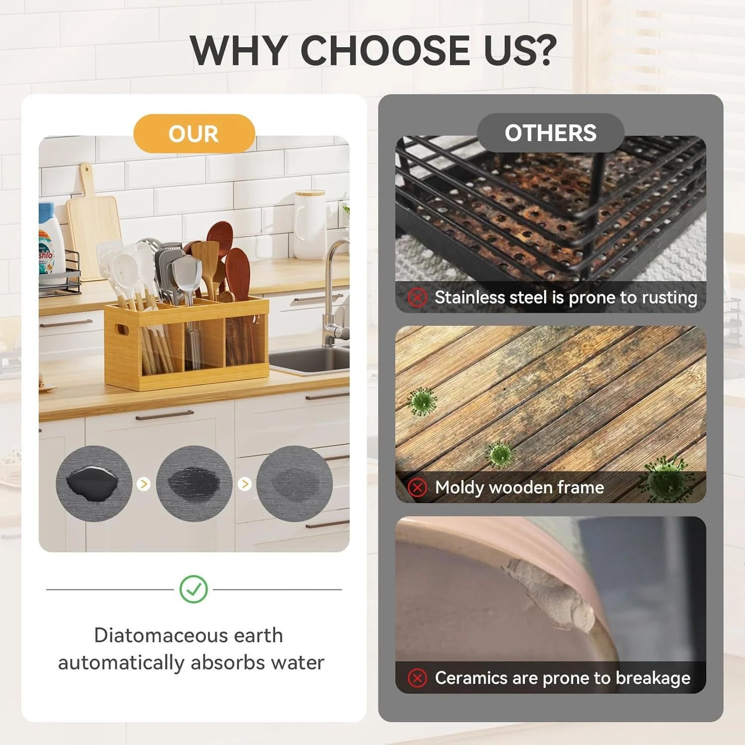- Moisture-Absorbing Diatomite Base – Keeps countertops dry and tidy