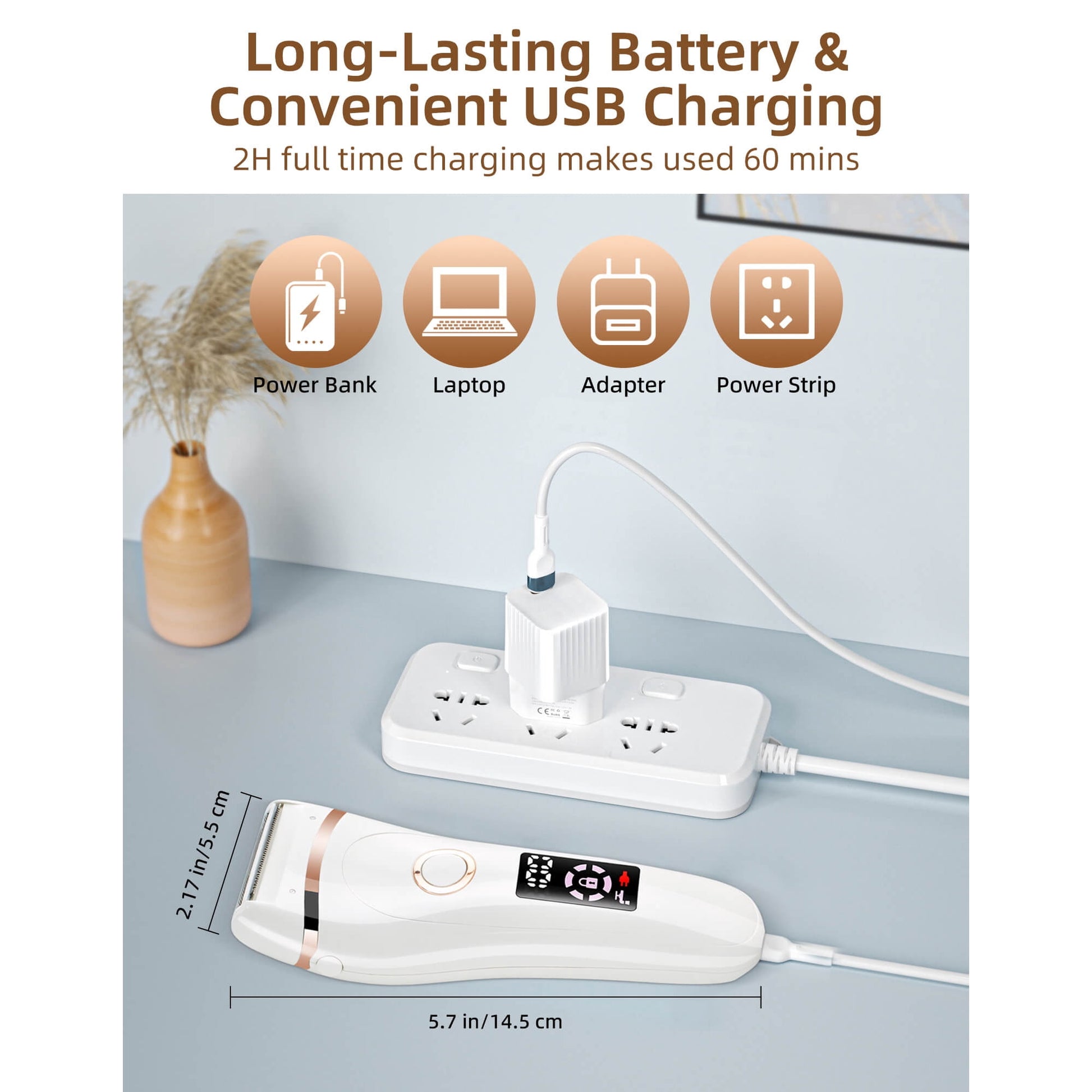 1.5H Quick Charge, 90 Minutes Shaving:The ladies electric shaver with Built-in rechargeable Lithium battery, the battery has a long life and does not require frequent recharging. Full charged in 1.5 Hours, lasts for 90 minutes shaving. USB charging make it available to charge by pc, power bank or direct power connection, and it's very light and small, very convenient for you to carry for travel anywhere. (just include cable, no include charger)