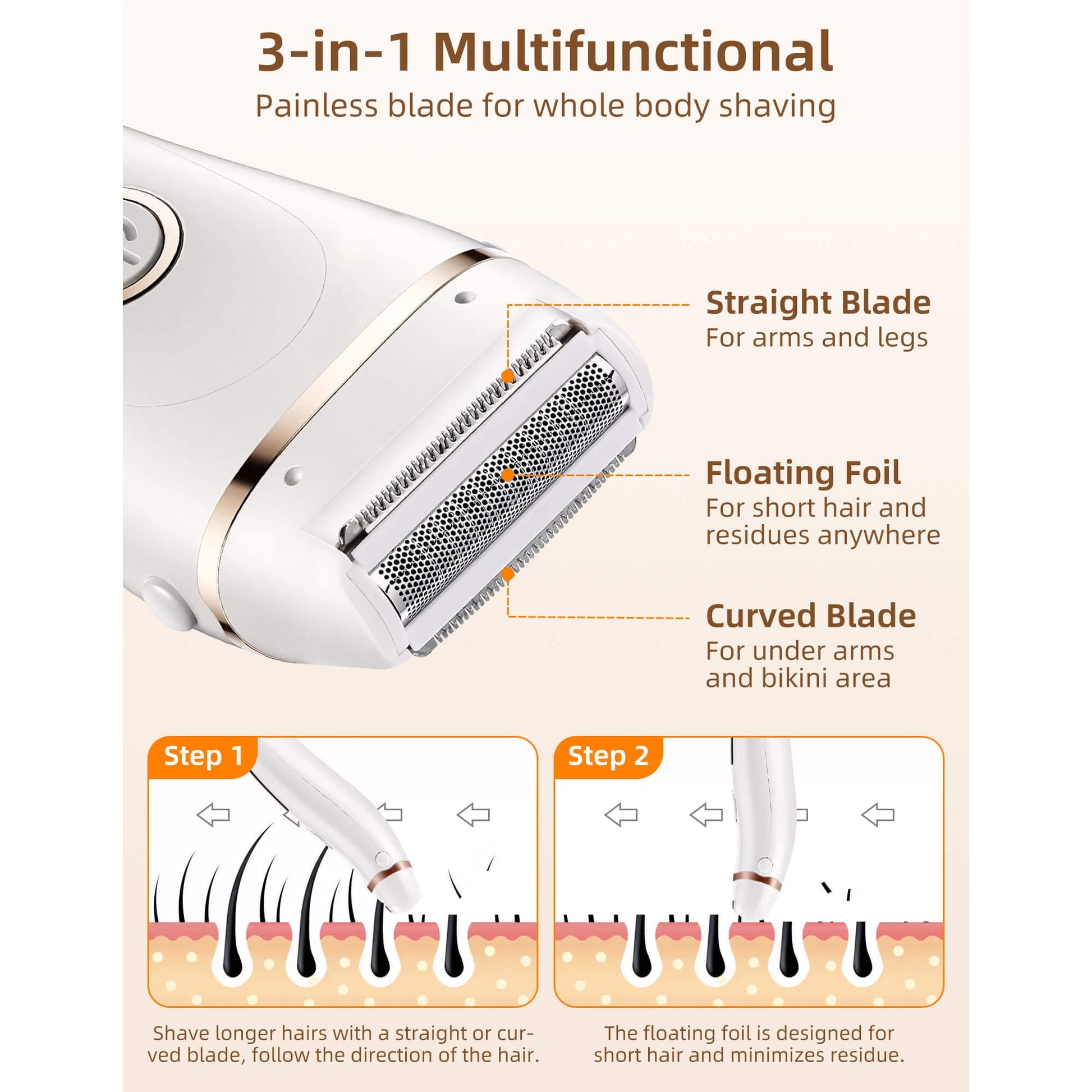 3-in-1 High Speed Shaving Head:Straight blade works well on arms & legs; Curved blade works well on armpit/underarms, bikini lines and other hard-to-reach areas, floating foil works best for trimming stubble to ensure safe but safe shave.