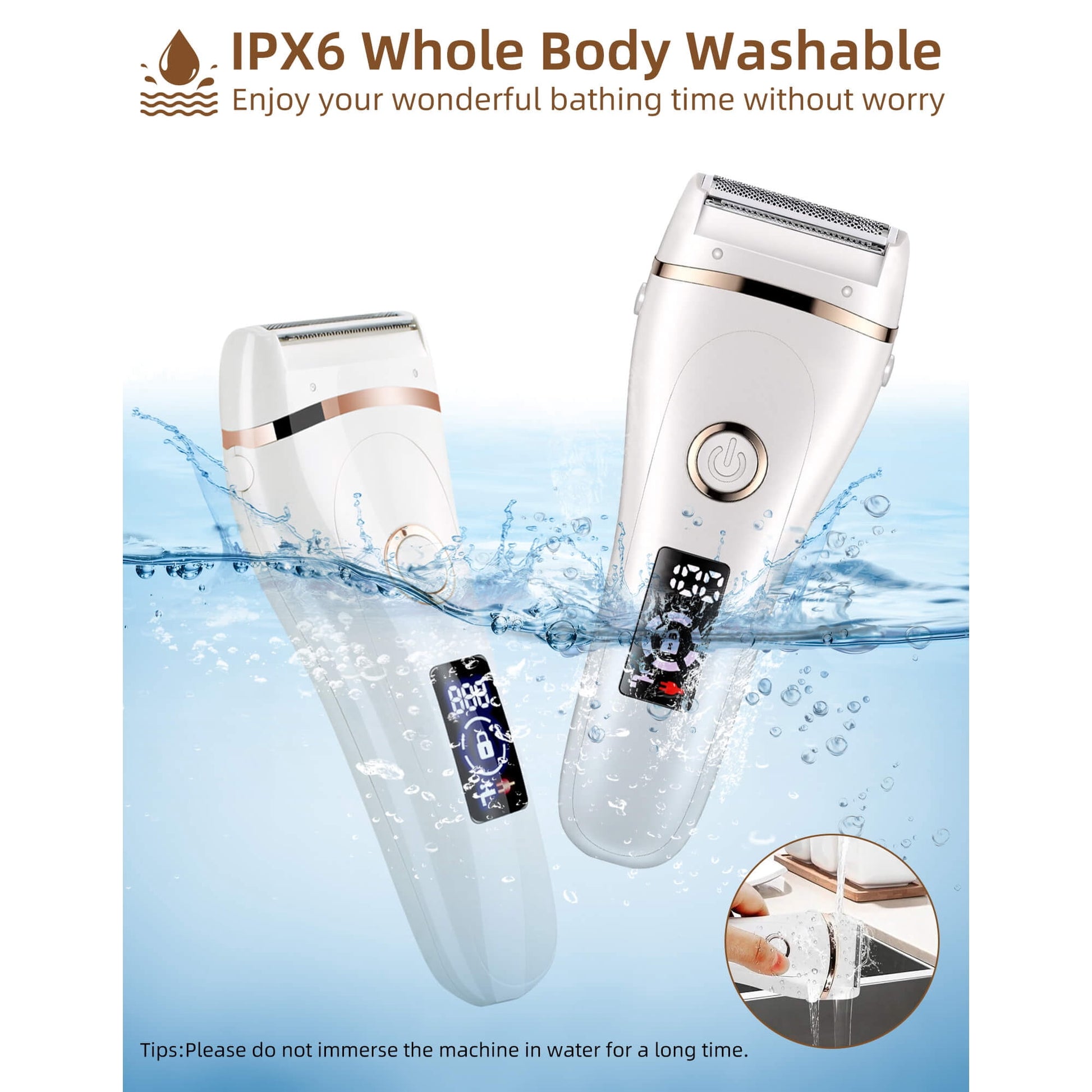 Warm Tips:1. This product is waterproof. It can be placed under the tap to rinse. Note: when flushing, the power must be disconnected and the power cannot be linked!2. Our machine is an electric razor which dose not put hair from the root but works better for skin without irritating. when using body shaver, please keep the razor at a 45 degree angle or 90 degree angle. Applying some moisturizer before shaving skin will be more effective.3. Please gently move the brush head circumferentially onto the facial skin. Avoid over-squeezing or avoid over-cleaning.4. High quality stainless steel blade is hypoallergenic. IPX6 Waterproof design can be used in the bathroom.