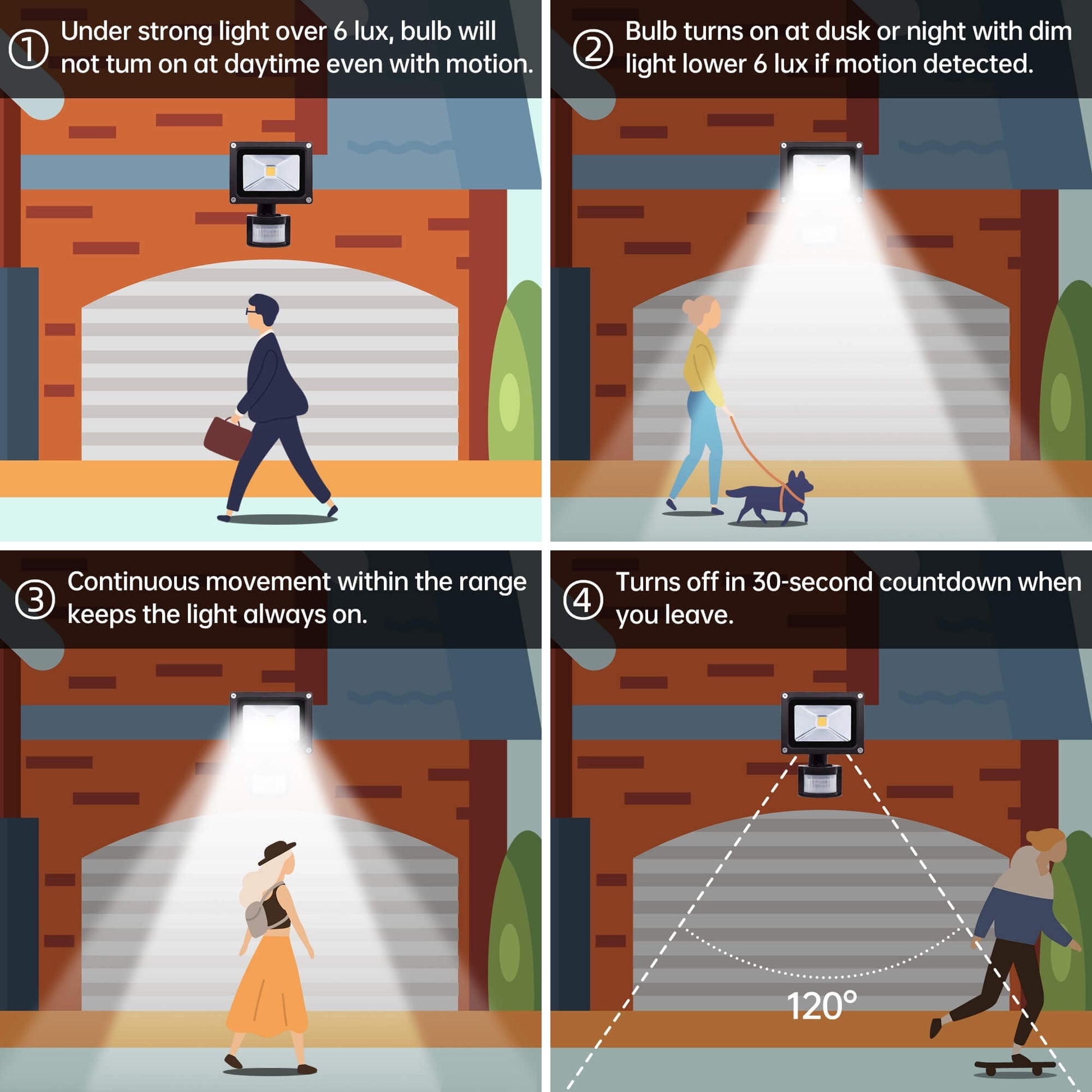 Intelligent Sensitive DetectorOutdoor Motion Sensor LED Flood Lights have three setting modes - Sensing time (sensitivity 6-360s adjustable), sensing distance (1-12 meters adjustable), sensor switch (automatically distinguish between day and night, can be set to open only at night, PIR (Passive Infrared) motion detectors are used to sense the motion of people, animals or other objects. They can be used in automatically activated lighting systems.